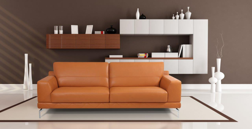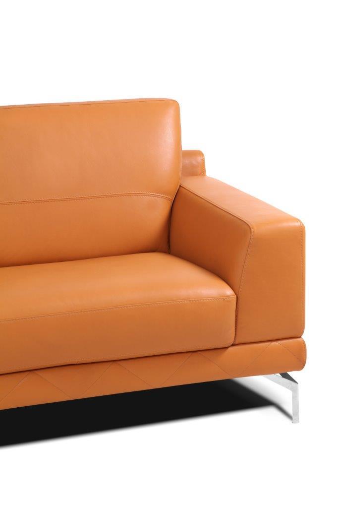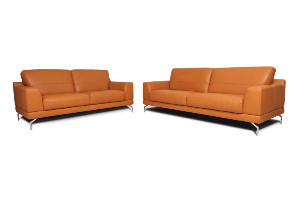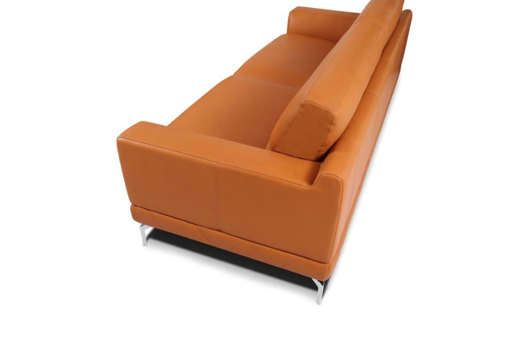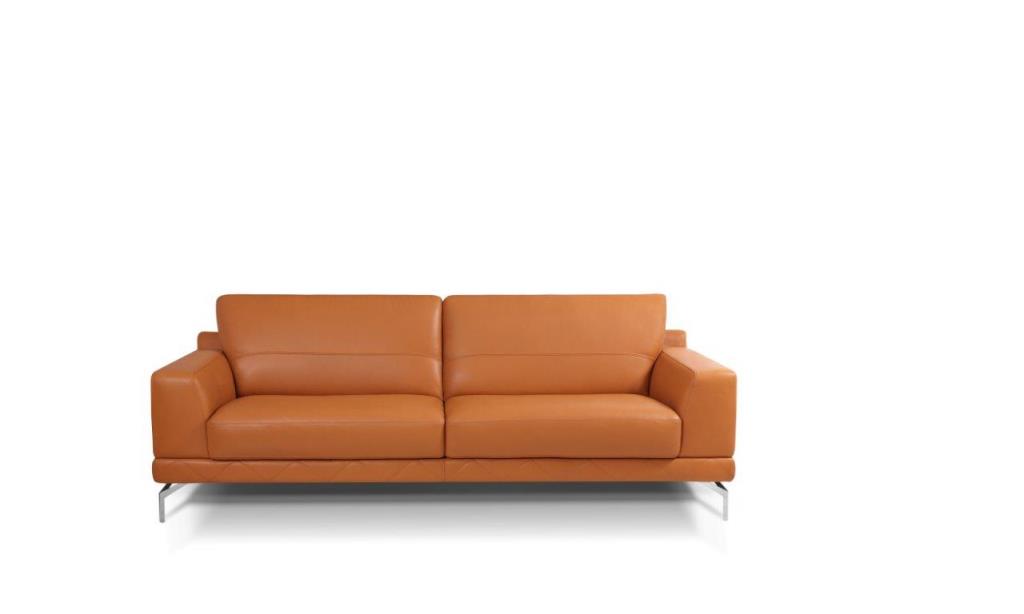 הספה המהממת מגיעה בעור או בבד, עם רגלי מתכת מעוצבים בזווית ייחודית